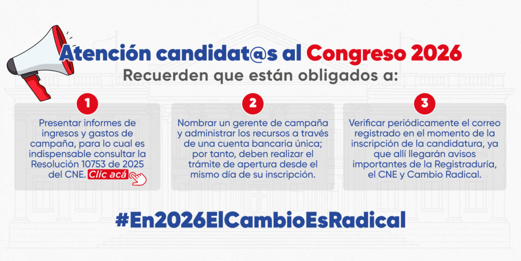 - Resolución 58 de 2025. Por medio de la cual se reglamenta el uso de la propaganda electoral para los candidatos del Partido Cambio Radical para las elecciones del Congreso de la República 2026 – 2030